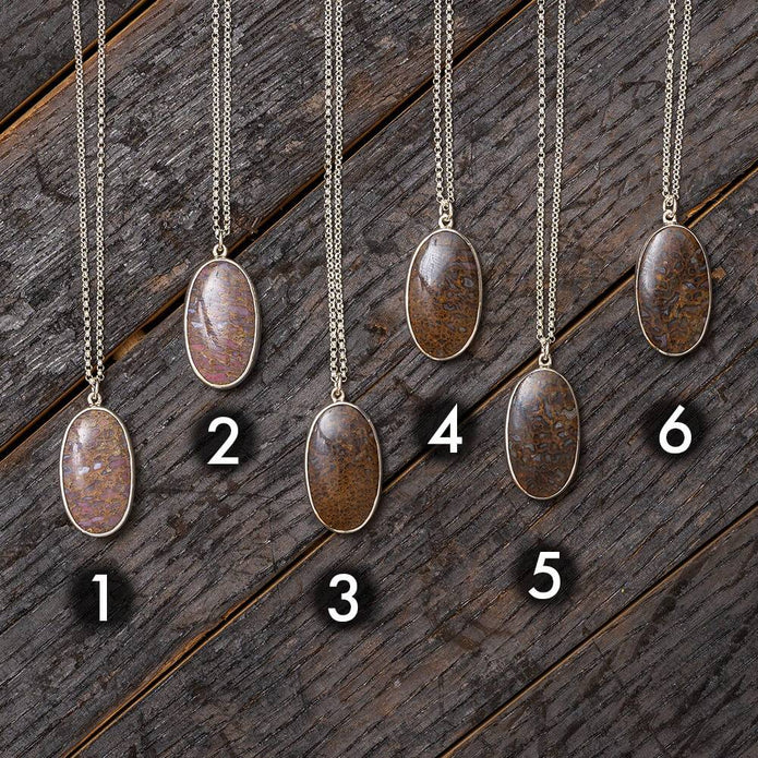 Wear a piece of pre-history with this fossilized dinosaur bone necklace! Each design is completely unique in pattern and color. The polished pendant hangs on an 18" rope chain. Give a one-of-a-kind gift for an upcoming special occasion.