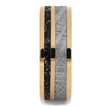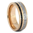 This 14k rose gold wedding band creates an image of space with black enamel, pieces of meteorite, and flakes of yellow gold. A solid piece of Gibeon meteorite is beside the black stardust, bringing the one-of-a-kind and otherworldly Widmanstätten pattern to this meteorite ring.