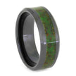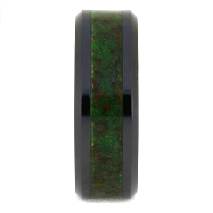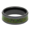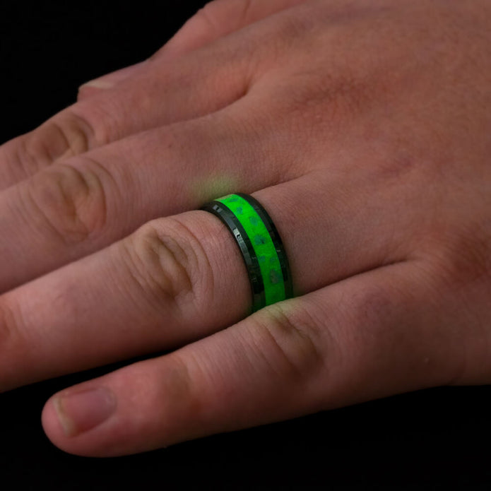 This black ceramic wedding band is lit up by a green glow in the dark inlay, complimented with Crushed Dinosaur Bone. This unisex wedding band has a glowstone and dinosaur bone inlay that has been crushed.