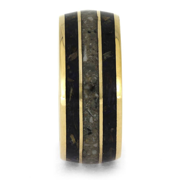 Honor your late companion with a 14k Yellow Gold memorial ring. This expertly crafted piece features two inlays of flower petals divided by the ashes of your pet. Simply supply the cremains and we will craft a personalized memorial ring.
