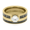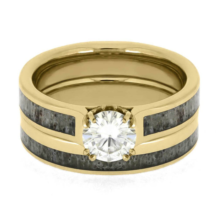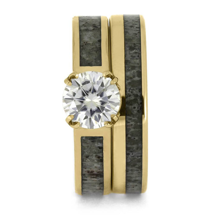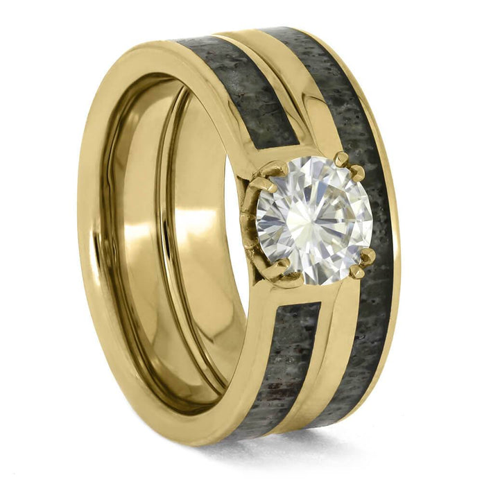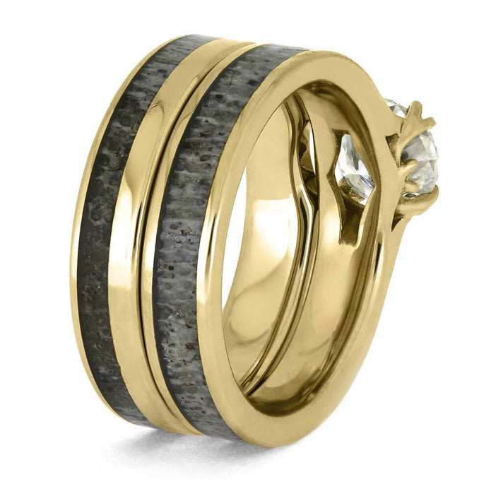 This Moissanite bridal set is ideal for those who love the outdoors. The set includes a uniquely crafted engagement ring and a matching wedding band, both featuring 14k yellow gold and naturally shed deer antler inlays. The wedding band is designed to sit perfectly alongside the engagement ring, creating a contemporary aesthetic.
