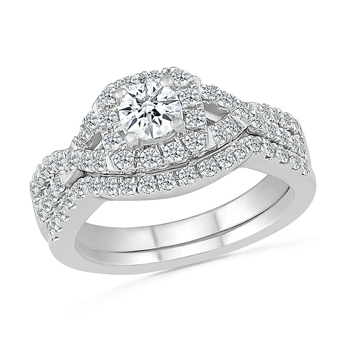 Radiating in sterling silver with 1 ct. t.w. of diamonds, this halo diamond ring set is sure to match the sparkle in her eye. A diamond accented bypass draws your attention to the brilliant center stone that sparkles like nothing you have ever seen. A curved, coordinating diamond wedding band seamlessly fits with the engagement ring.
