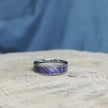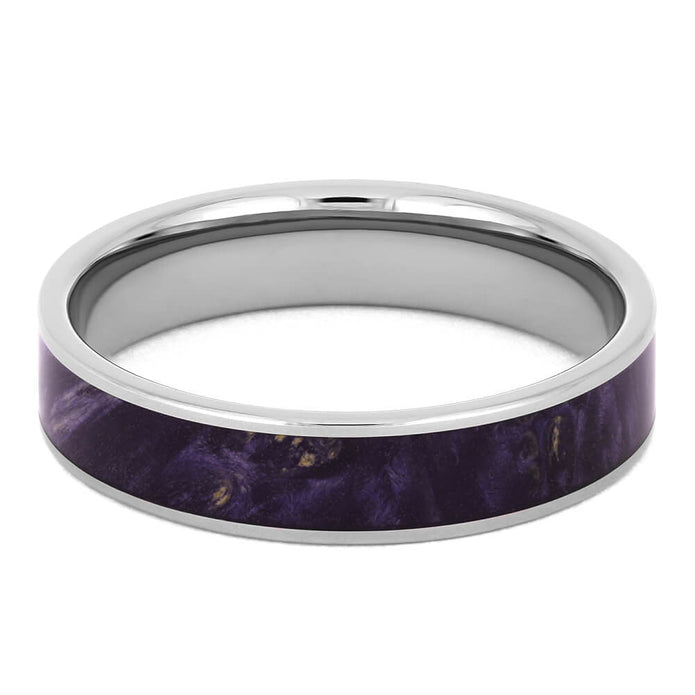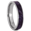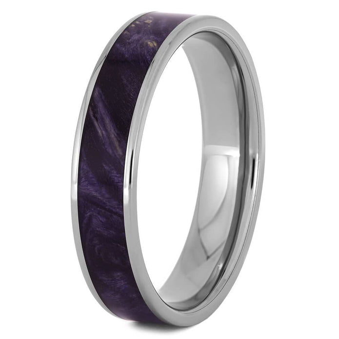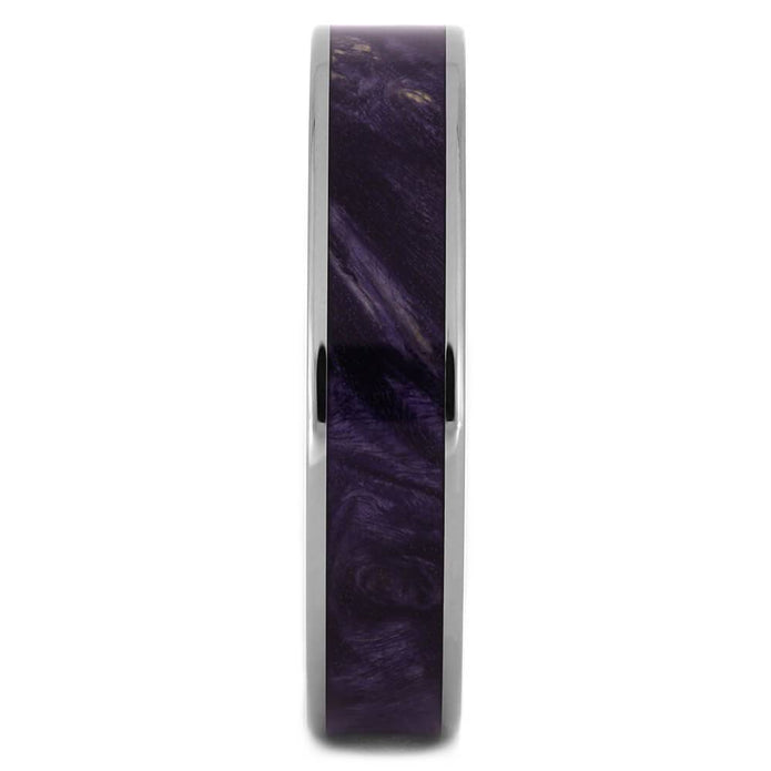 This purple wood wedding band is perfect for someone who wants a colorful ring. The deep purple box elder wood burl has good contrast with the polished titanium that frames it.