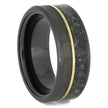 An earthy wedding band hosts crushed jade and obsidian separated by a polished 14k yellow gold pinstripe. This black ceramic men's wedding band is sure to add a natural touch to your style.