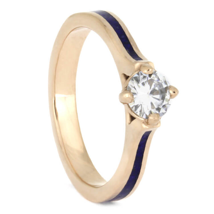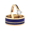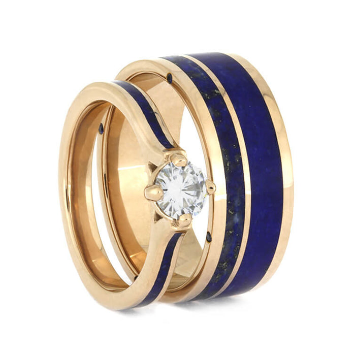 A lustrous assortment of blue sapphires and a moissanite adorn this lapis lazuli wedding ring set. The 14k rose gold wedding band has four blue sapphires decorating each side, and has a dense, blue inlay of detailed lapis lazuli. The matching solitaire engagement ring is compass set with a sparkling round moissanite, which shines in every light. Show off your vibrant, colorful style with this unique, couples wedding ring set!