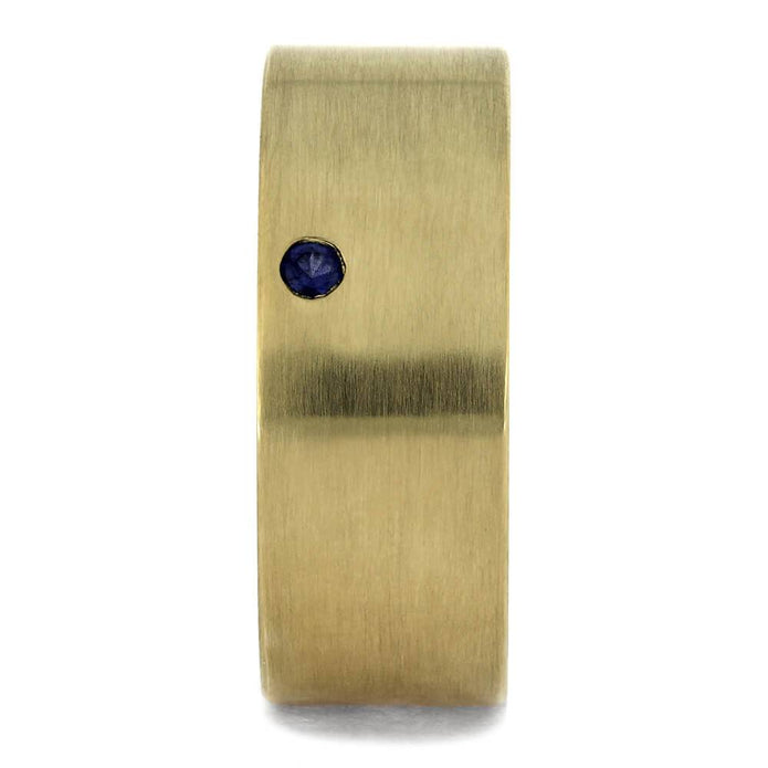 Simple but still unique, this solid gold men's ring features a masculine, matte finish and a round cut sapphire. Flush set and asymmetrically positioned on the ring's surface, the tiny stone can be representative of a birthstone, loved one's birthstone or simply just a stone in your favorite color.