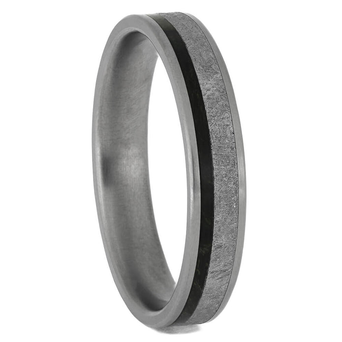 Add a stellar look to your everyday attire with this men's meteorite wedding band. This titanium wedding band is inlaid with real Gibeon meteorite next to a thin pinstripe of green box elder burl. Browse through my many in stock meteorite rings or custom design your very own today.