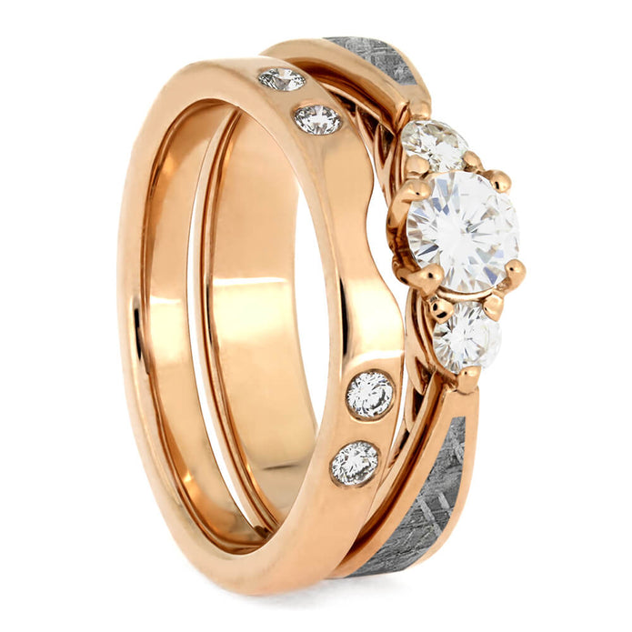 Meteorite Bridal Set, Three Stone Moissanite Ring & Matching Band