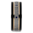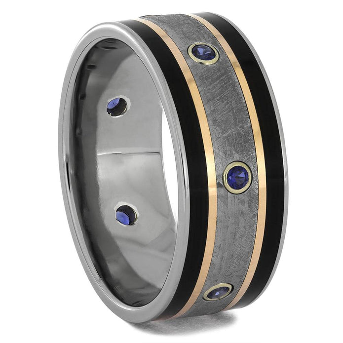 This gorgeous men's wedding band features a center inlay of meteorite with bezel set gemstones; sapphires are featured, but a different stone of your choice can be substituted. Polished pinstripes of rose gold along with ebony wood inlays frame the space rock giving a complementary contrast and masculine look. This ring makes the perfect band for any rock star with its ebony wood and REAL star components!