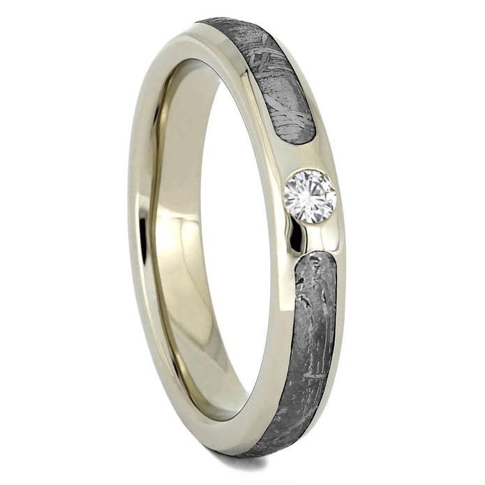 An eye-catching round cut Moissanite gleams at the center of this wonderful gold meteorite engagement ring. The solid, natural meteorite has been etched to reveal the characteristic patterns, or Widmanstatten figures, wrapping all the way around. This amazing ring is sure to light up her eyes!
