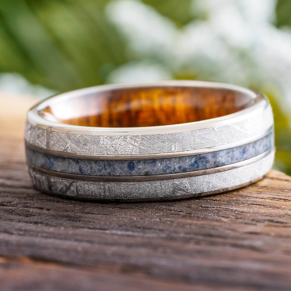 Materials in Meteorite and Sapphire Wedding Band for Men with Koa Wood