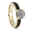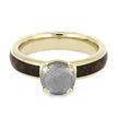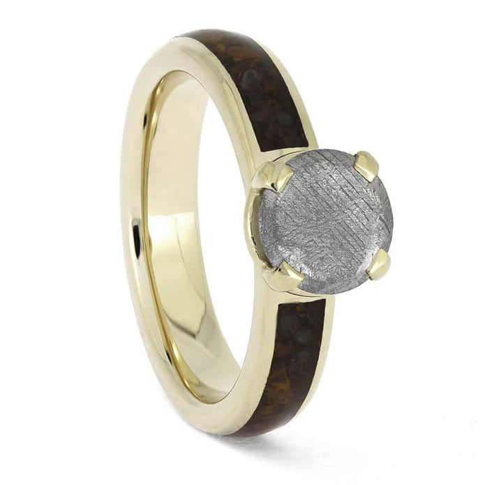 This exquisite 14k white gold engagement ring features a Gibeon meteorite stone, setting it apart from conventional designs. For a prehistoric twist, the shanks of the ring are decorated with genuine dinosaur bone inlays.