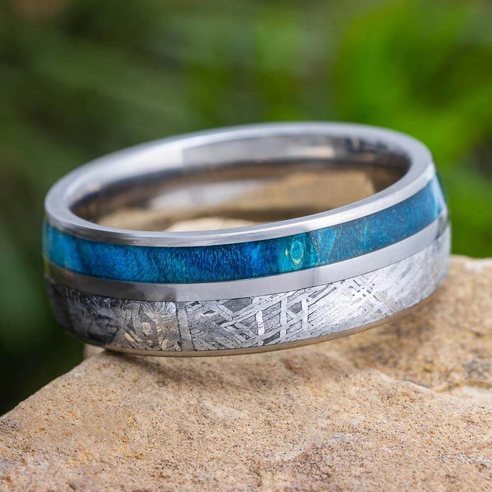 This exceptional Gibeon meteorite wedding band features a wonderful blue box elder burl stripe on a titanium band. The polished titanium band adds an attractive accent for the genuine meteorite and swirling night sky colors in blue box elder burl wood.