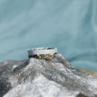 With just one glance this meteorite wedding band has the ability to capture your attention. A swirling black and white composite mokume gane edge complements the Gibeon meteorite on the other side. These uniquely patterned materials are split by a smooth, 14k solid yellow gold pinstripe down the center and held by a comfort fit titanium sleeve.