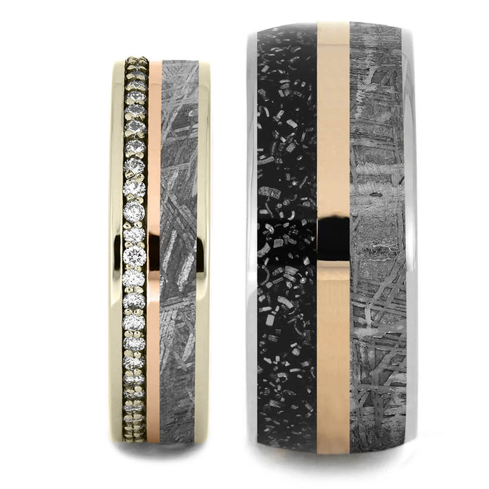 Shine like the stars themselves with this meteorite wedding band set. Each ring is decorated with their own unique materials. The women's wedding band displays a sparkling diamond eternity ring while the mens wedding band is inlaid with bold, black Stardust™. Coordinating meteorite and 14k rose gold pinstripes make these rings unite, the perfect pair to symbolize your eternal love.