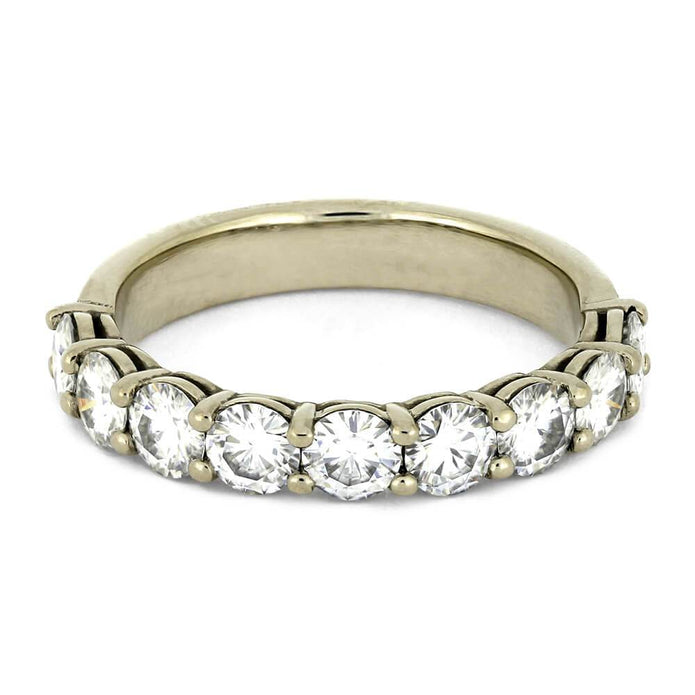 Enhance your prized engagement ring with a custom-made Moissanite wedding band. We here at Jewelry by Johan can tailor make a wedding band just for you. This 14k white gold wedding band is equipped with ten sparkling moissanites for the most romantic of looks.