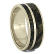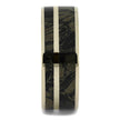 This stunning men's wedding band features swirling, mokume gane. This composite, black and gold material can be inlaid in 14k white gold with an off-set pinstripe. Customize the ring to feature a different mokume gane color option if desired.