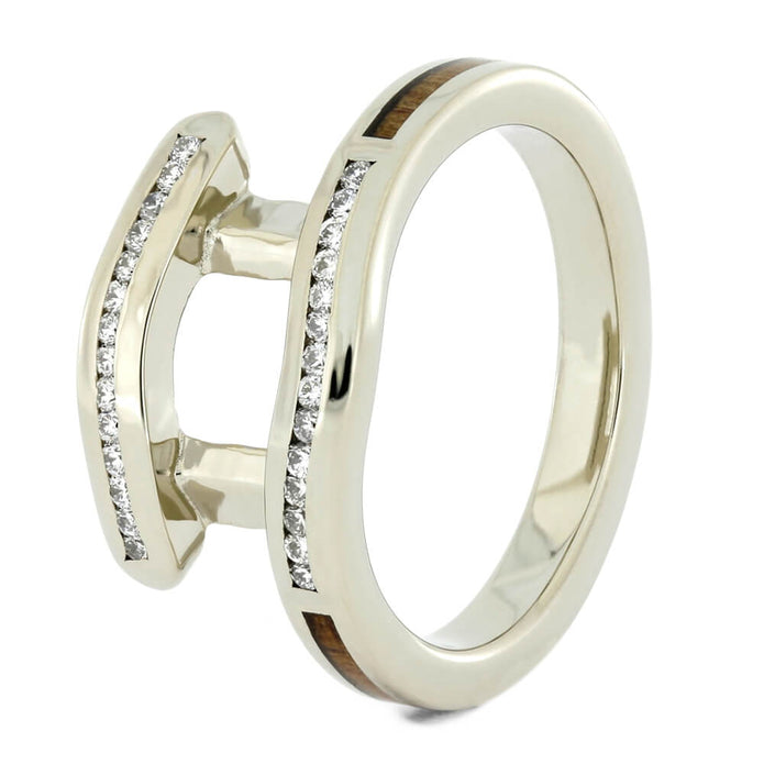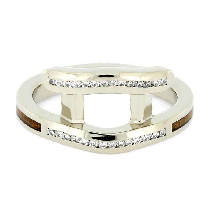 This gold ring guard can be customized to fit to your engagement ring. Koa wood and diamonds bring life to the ring while also not stealing the show from the engagement ring.