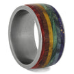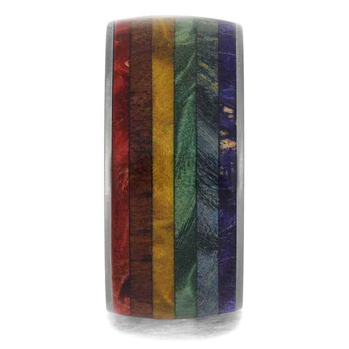 Celebrate Pride with this rainbow wood ring! This handmade ring is crafted with six varieties of colored wood for a stunning rainbow design. The titanium sleeve has a comfort fit profile and gives the ring style and strength.