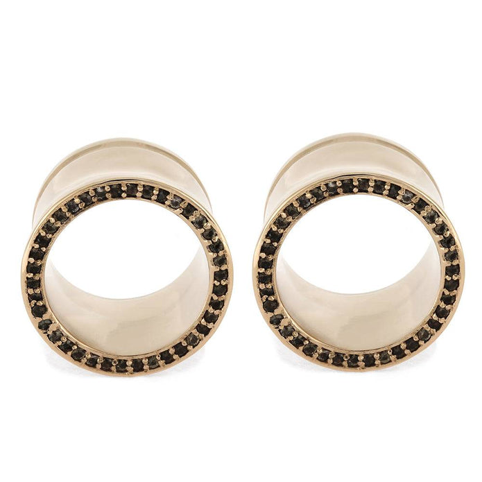 Make a statement with these stunning gold ear gauges, featuring a ring of smoky quartz stones set in an eternity design. Each handmade earring is expertly crafted in polished 14K rose gold, highlighting the deep, alluring accents of 22 flush-set, round smoky quartz stones (1 mm each, AA quality). The arrangement of stones is featured on only one side of the gauges, adding a unique touch to these bold rose gold gauge earrings. Perfect for anyone seeking a luxurious and eye-catching addition to their jewelry collection.