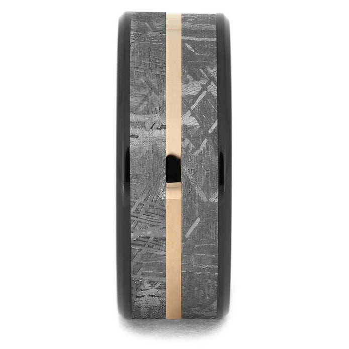 A crisp, sleek, and stylish beveled black ceramic band encases this masculine 14k rose gold meteorite ring. Genuine inlays of Gibeon meteorite are separated by a lustrous pinstripe of 14k rose gold. Add a splash of color to your space ring with this gold pinstriped wedding band!
