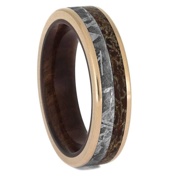 This men's wedding band features an amazing combination of unique materials both inside and out. Dinosaur bone and meteorite are showcased on the ring's exterior, framed by brushed 14k rose gold edges. Inside the ring, gorgeous redwood coated with our Ring Armor protection making it durable, waterproof and extremely comfortable.