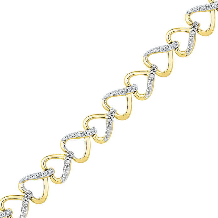 In this carefully crafted diamond bracelet, delicate hearts are linked together. Choose to order it in sterling silver or your choice of yellow, rose or white gold. This diamond heart chain bracelet is 7.25 inches in length and secures with a claw clasp.