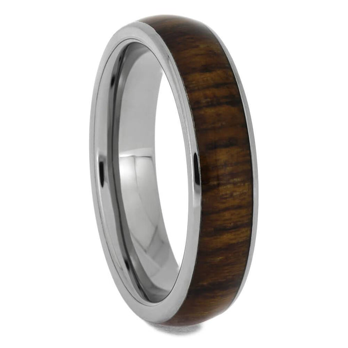 For the groom who loves nature, this wood wedding band shows off the beauty of a simple wood inlay on a round profile. The warm tones of teak wood contrast well with the polished titanium edges, which draw the eye to the natural wood grain.