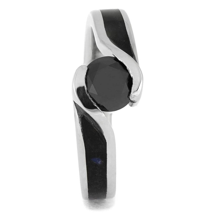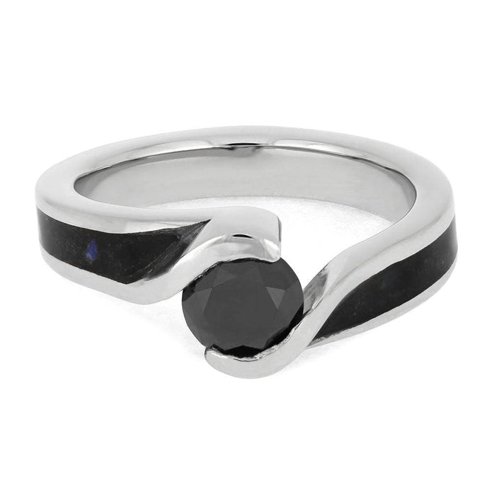 Celebrate your love with a unique and colorful engagement ring. Crushed labradorite speckles the shanks of this platinum engagement ring. A black diamond is held in a faux tension setting, highlighted by the platinum bypass.
