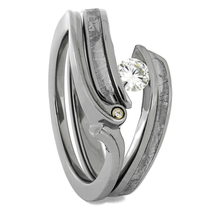 This meteorite bridal set pairs two amazing titanium rings. Both rings are shaped to fit against one another while on your finger. The engagement ring has a meteorite inlay and tension setting, while the wedding band has a tiny bezel-set accent stone. A stellar bridal set if you're looking for something non-traditional!