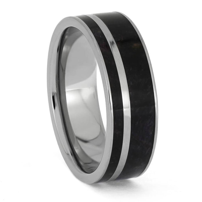 Materials in Titanium Ring with Purple Box Elder Burl Wood and Titanium Pinstripe