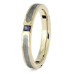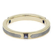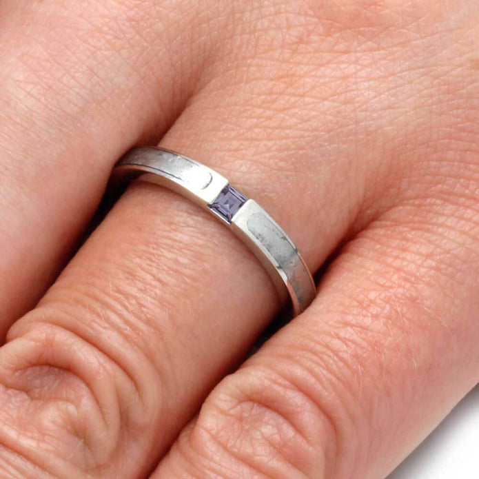 This handmade wedding ring is crafted with three square-cut alexandrites as its focal point. They are surrounded by three solid, natural meteorite inlays, carefully etched to display the distinctive Widmanstatten patterns that encircle the entire ring. This unique birthstone ring is perfect for space geeks and science enthusiasts alike!