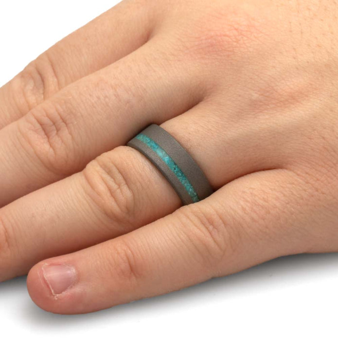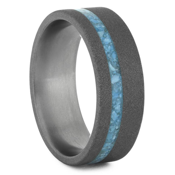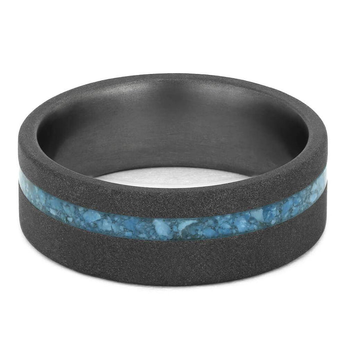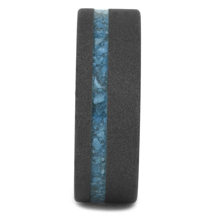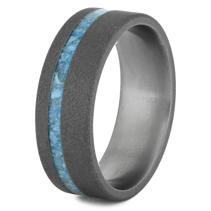 This men's wedding band is a great way to bring some subtle color to your style. The crushed turquoise is surrounded by sandblasted titanium, highlighting the mixed blue tones.