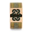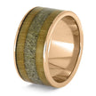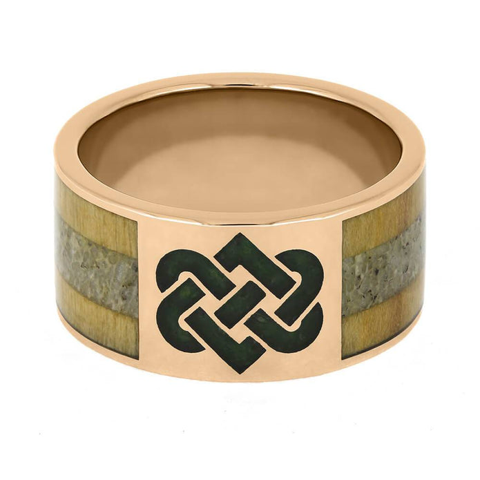 This one-of-a-kind ring features so many amazing elements, including a Celtic knot inlaid with crushed peridot. The band is inlaid with birch and antler. With its wide and masculine design, this men's wedding band is perfect for your groom who takes great pride in his heritage.