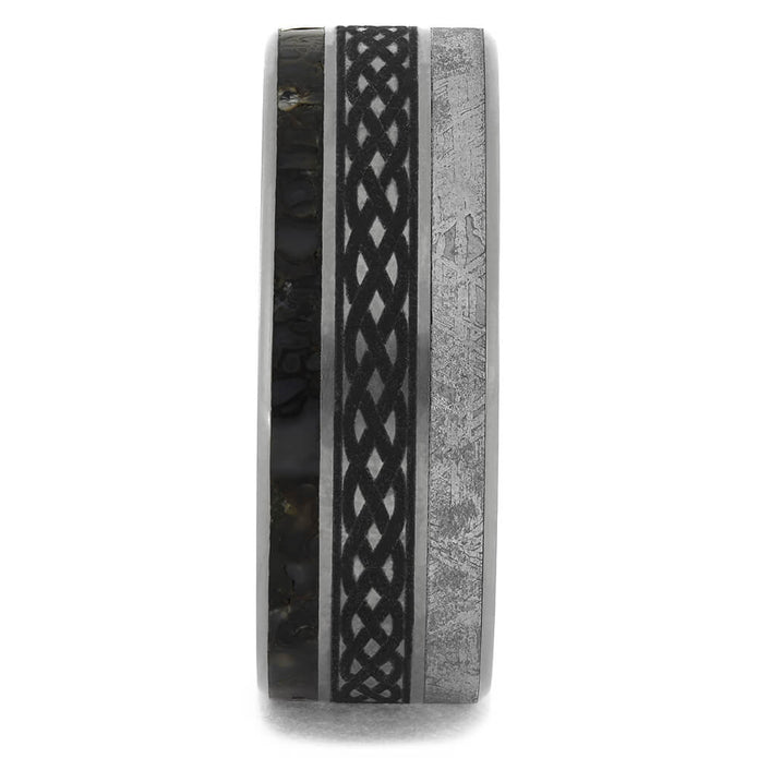 Men's Wedding Band With Meteorite, Wood & Celtic Engraving