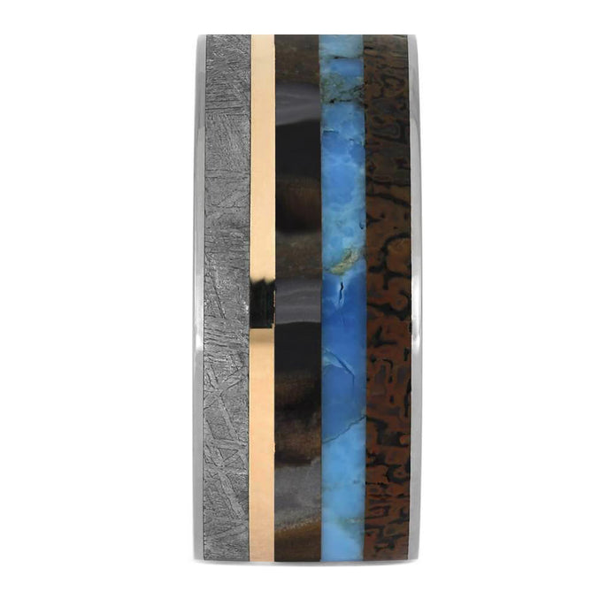 Materials in Unique Men's Ring with Meteorite, Dinosaur Bone, Turquoise and Petrified Wood