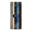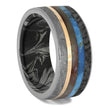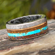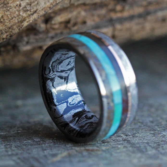 This is a very unique ring bursting with all kinds of organic elements. The turquoise wedding band is inlaid with real Gibeon meteorite, fossilized dinosaur bone, and petrified wood. The dark and mysterious sleeve is crafted with a swirling pattern of black and white mokume. To complete this extraordinary piece of jewelry, a thin rose gold pinstripe is added just for the perfect hint of shine.
