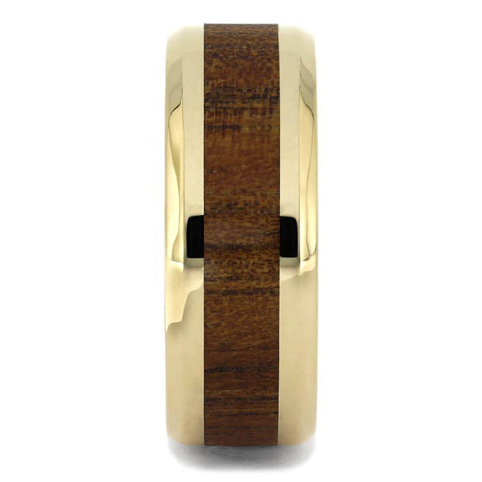 This wood and solid 14k gold ring with beveled edges provides an attractive combination of solid gold and Hawaiian koa inlay. Its beveled edges and superior craftsmanship make it a high-quality accessory for a men's wedding band or for an everyday ring.