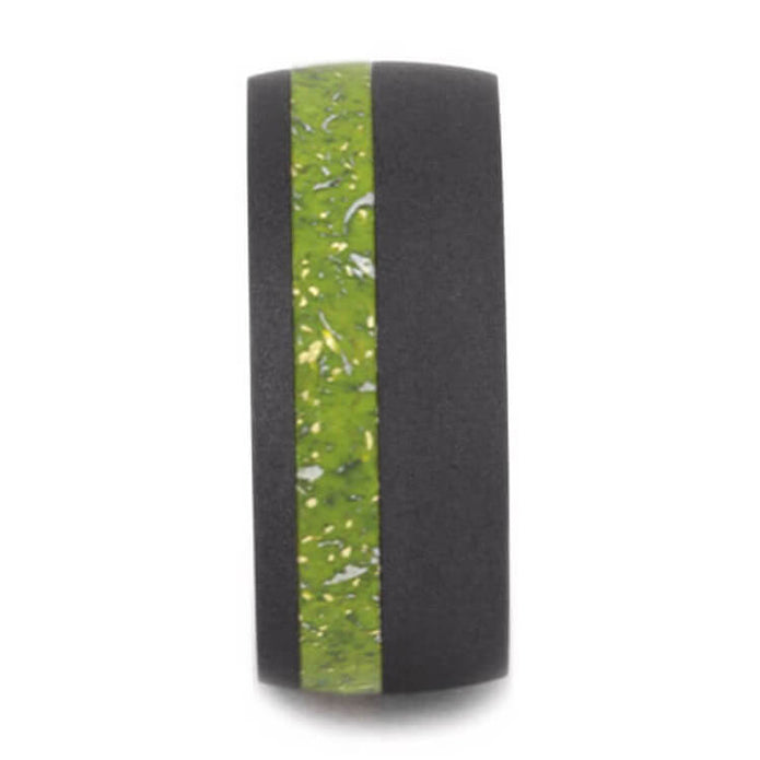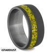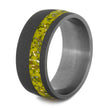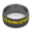 A perfect yellow Stardust™ wedding band for your significant other. This round profile sandblasted ring is handmade with yellow Stardust™ that displays shavings of meteorite and yellow gold. Although this is our yellow colored enamel, the meteorite gives the yellow tint a cool, lime green appearance.