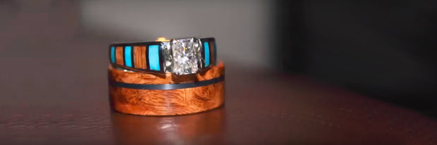 We were honored to be entrusted by Erin and Eric to create both of their wedding rings. A unique cathedral style engagement ring and coordinating wood wedding band for him.