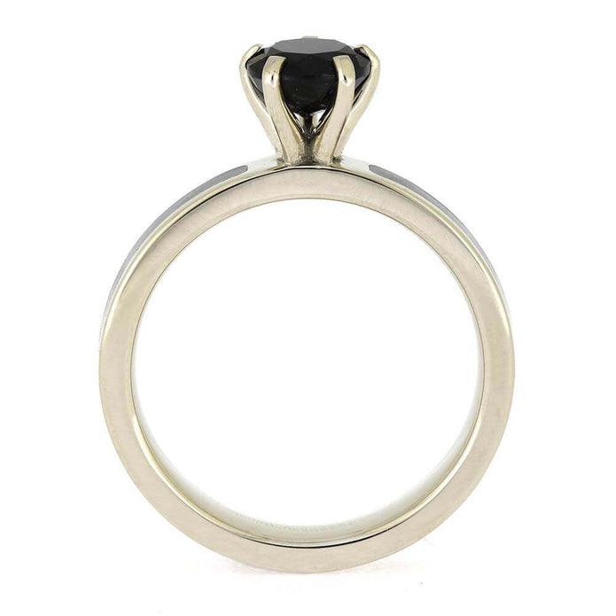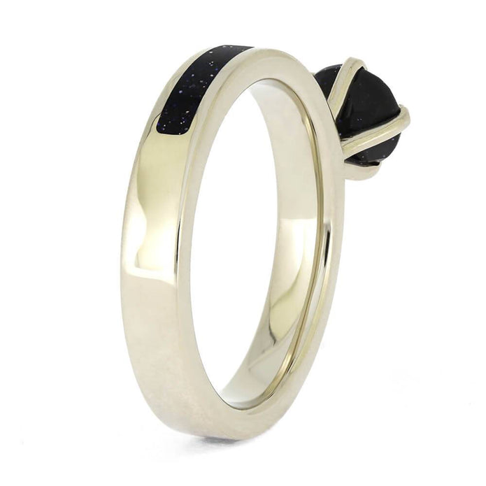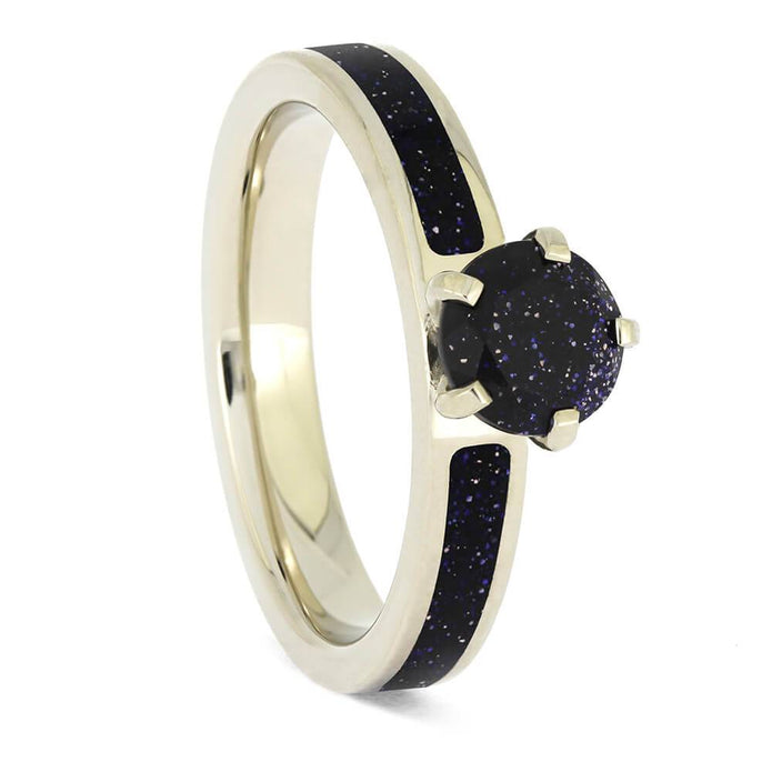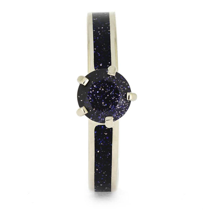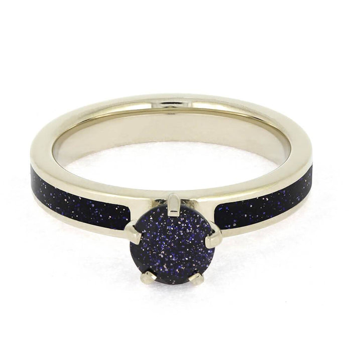 This solitaire engagement ring features a classic round-cut design with a five prong setting. Upon closer examination, its blue goldstone inlay adds a unique twist to the traditional design. For those seeking a timeless yet unconventional engagement ring, this blue goldstone solitaire is the perfect choice!