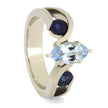 One of the most unique three stone rings there is! This marquise cut aquamarine engagement ring is accented with two round cut blue sapphires. The beautiful swirling shank is made with 14k white gold and inlaid with real Gibeon meteorite. A stellar, alternative engagement ring for your amazing bride to be.