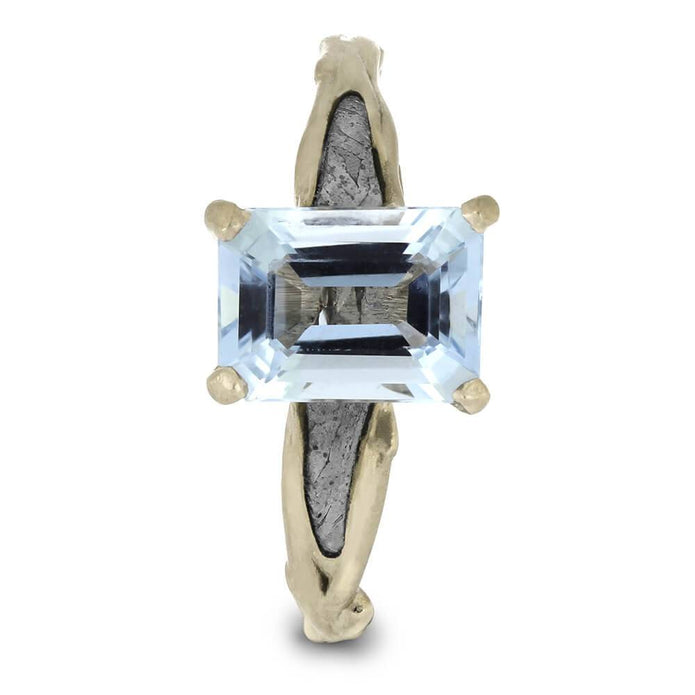 Meteorite and an emerald-cut aquamarine give this handmade solitaire a stunning, natural style. The 14k white gold band features an organic twisting design that is reminiscent of natural branches. Get this nontraditional engagement ring for the outdoors enthusiast you love.