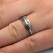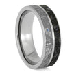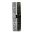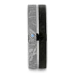 Match her aquamarine engagement ring with this men’s aquamarine wedding ring. The platinum band is inlaid with rare Gibeon meteorite and dinosaur bone. Each material has their own pattern that will not be found in any other piece. A thin platinum pinstripe divides the meteorite and dinosaur bone for a sleek style.