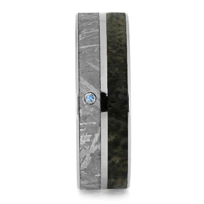 Materials in Men's Platinum Wedding Ring With Meteorite, Dinosaur Bone and Aquamarine