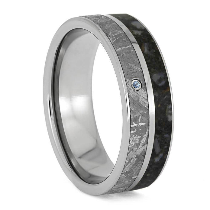 Men's Platinum Wedding Ring With Meteorite, Dinosaur Bone and Aquamarine
