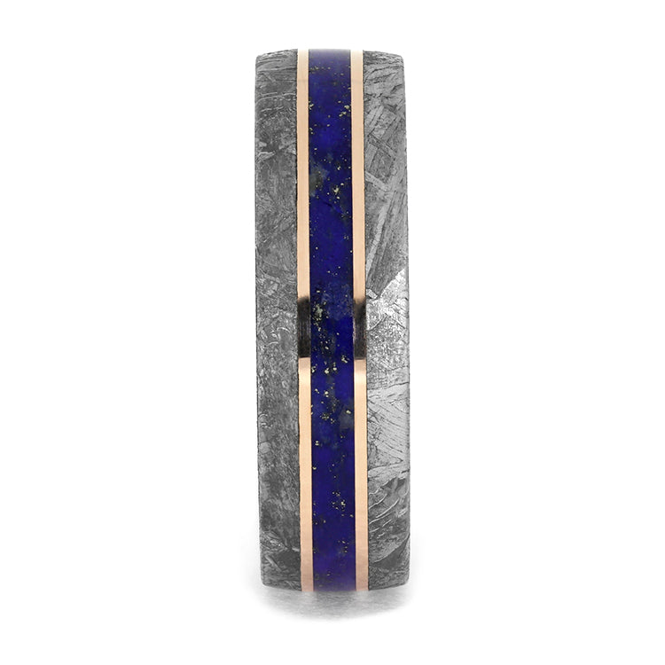 Bring some color into your life with this 14k rose gold meteorite ring. The lapis lazuli in this beautiful wedding band is a great way to bring that something blue to your wedding.