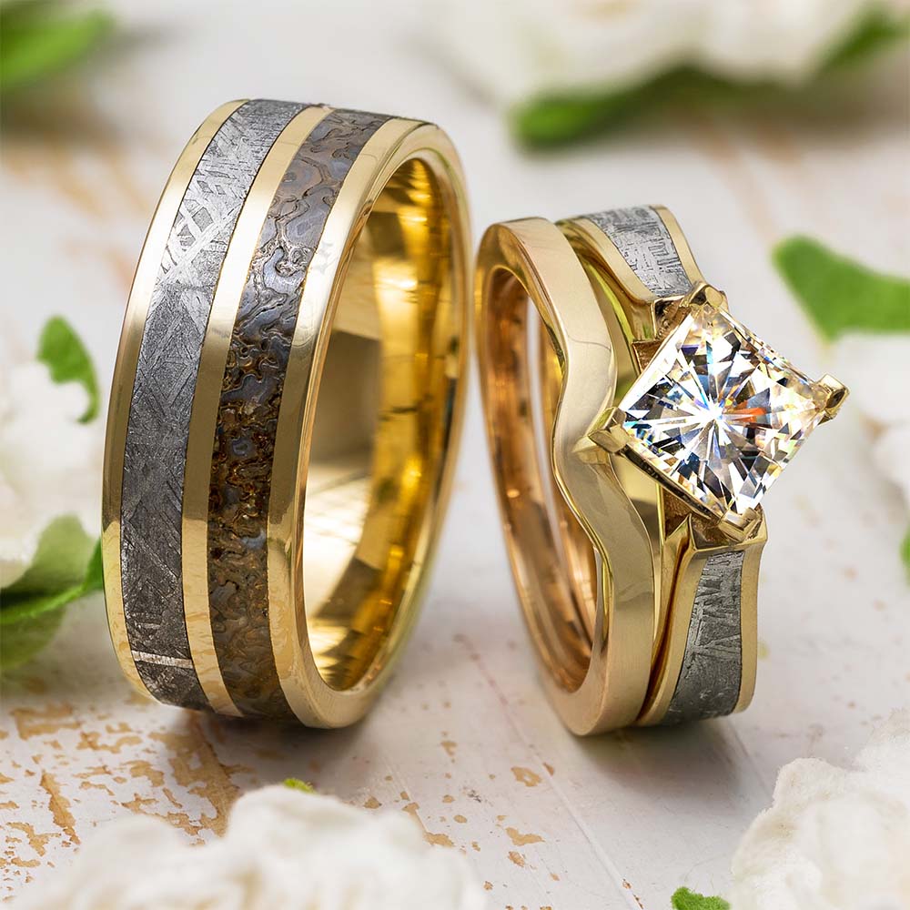 Dinosaur bone his and hers wedding ring set from Jewelry by Johan.