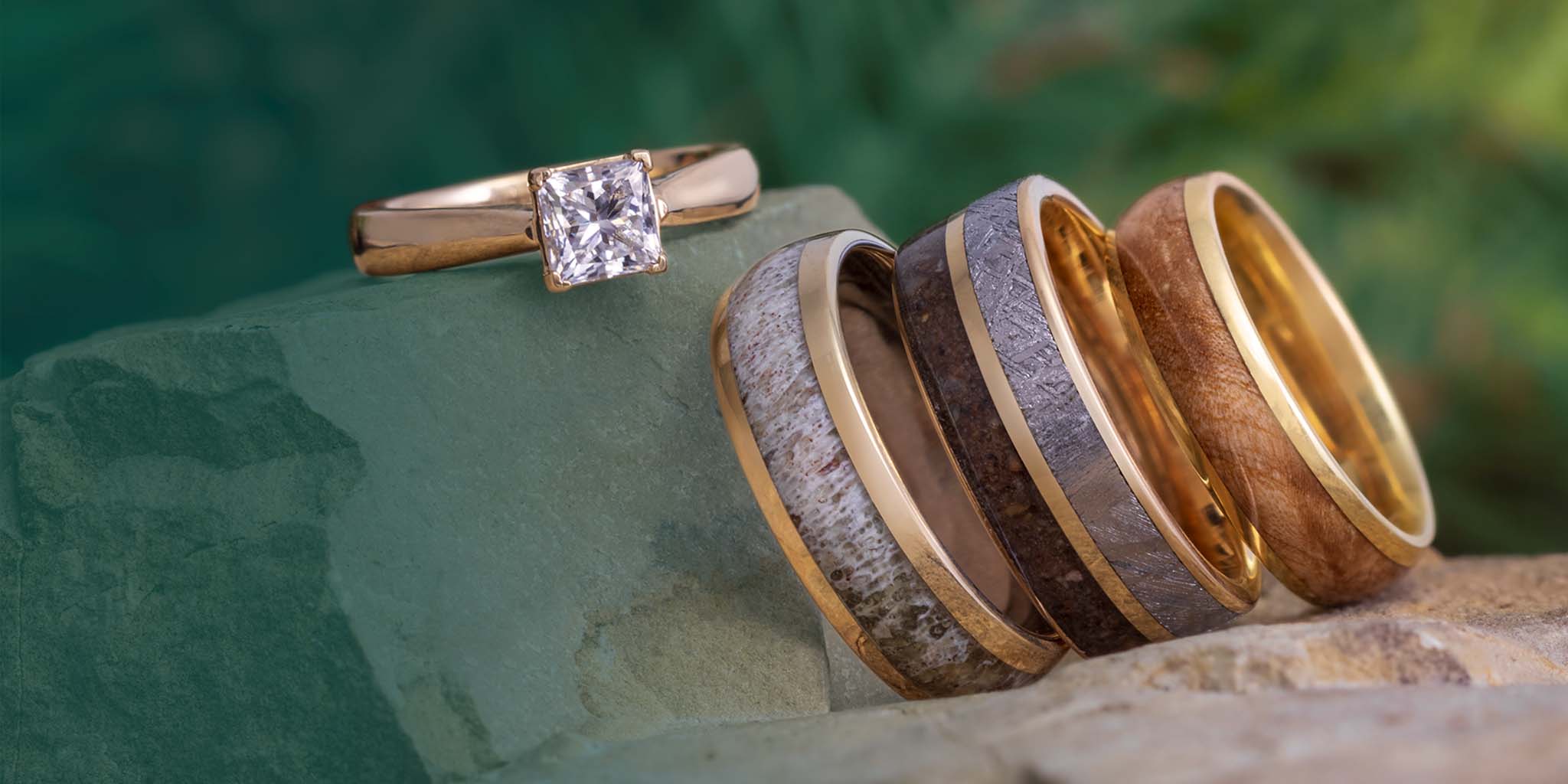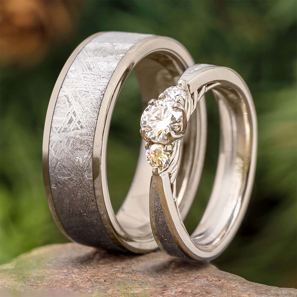 Men's meteorite wedding rings displayed together on a stone surface.