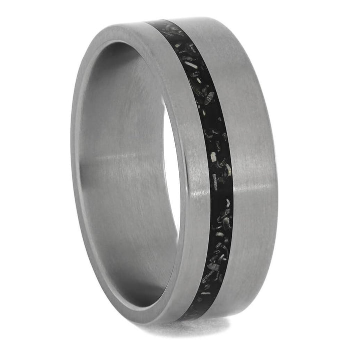 This black stardust wedding band is crafted in matte titanium, giving it a masculine look, and is inlaid with sparkling stardust. The patterns and colors in the black stardust are unique to each piece, so your ring will be truly one of a kind! Stardust jewelry is a unique way to express your love for astronomy and our beautiful galaxy. It's created by combining real flakes of meteorite and colored enamel.